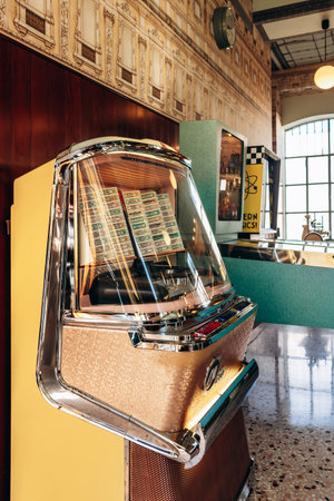Milan, Italy - March 19, 2025 : Vintage jukebox in Bar Luce at Fondazione Prada Milan retro interior