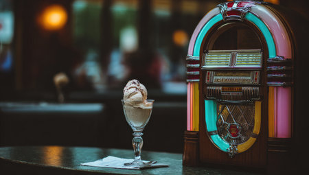 Scoop of ice cream in a glass sits next to a vintage jukebox on a dark wooden table in a restaurant or cafe. The background is out of focus, creating a sense of depth and ambiance.