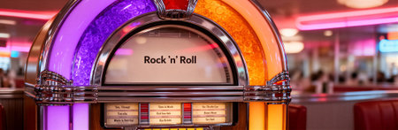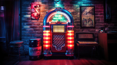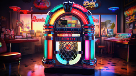Retro jukebox in vintage diner with neon lights and rock n' roll theme. That the image is generated using AI.
