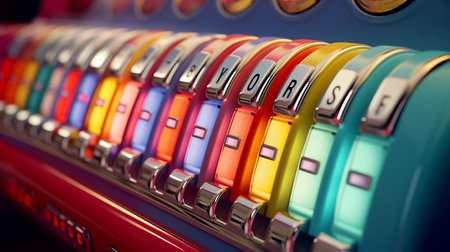 Closeup view on buttons of vintage music box at diner restaurant. Electronic machine for choosing melodies during party celebration and rest at cafe. Generative AI