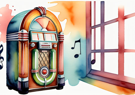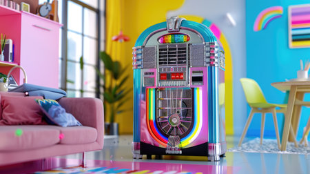 This image showcases a colorful retro jukebox in a vibrant indoor setting, accented by playful decor and cheerful colors, creating a nostalgic atmosphere.