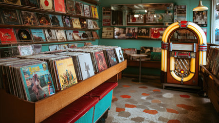 Vintage record store interior with colorful vinyl covers displayed on wooden shelves and a jukebox in the corner