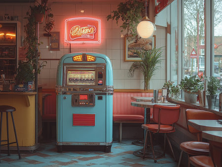 Retro diner corner with vintage jukebox and cozy seating area