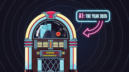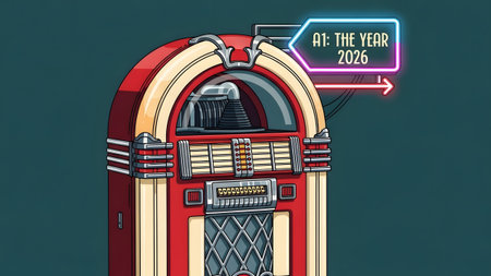 A red vintage jukebox features a glowing neon sign that reads A1: THE YEAR 2026. Clear details ...