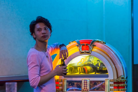 Young guy setting on jukebox
