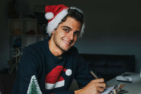 A cheerful man in a red sweater gazes upwards with a smile, envisioning presents in a cozy room adorned with holiday lights and decorations.