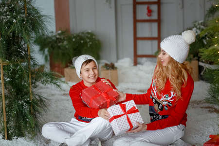 Beautiful young mother and son in a Christmas dwarf costume on the background of Christmas decorations