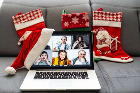 Remote Christmas video party. Family zoom call celebrate New Year 2022 Online video conferencing. Virtual meeting conference calling from home