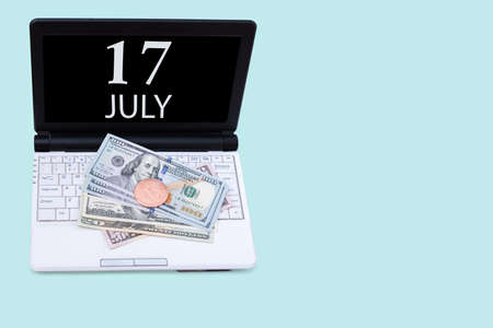 17th day of july. Laptop with the date of 17 july and cryptocurrency Bitcoin, dollars on a blue background. Buy or sell cryptocurrency. Stock market concept. Summer month, day of the year concept.