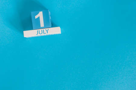 July 1st. Image of july 1 wooden color calendar on blue background. Summer day. Empty space for text.