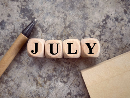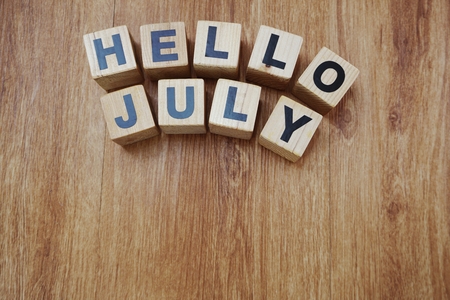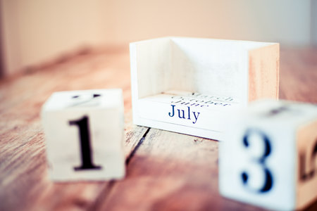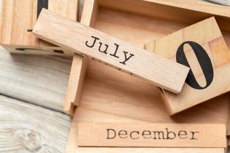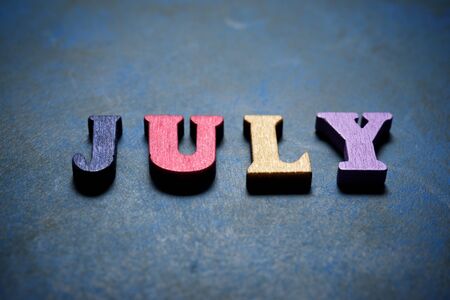 Month, time and celebration concept. JULY written on wooden blocks. With blurred styled background.