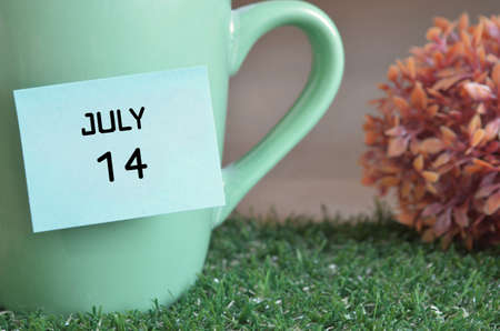 JULY word on wooden cube on black gloss wooden table. Selected focus
