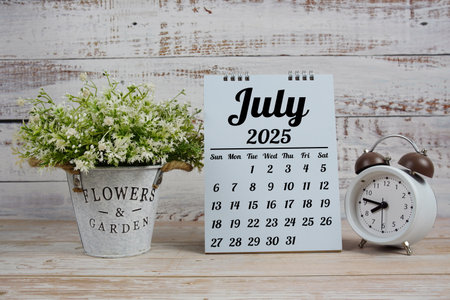 July text and United States of America flag on wooden table background. USA holiday of Independence and celebration concepts