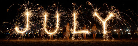 Banner with fireworks spelling July at night with glowing sparks illuminating the dark sky and beach