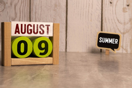 Cube shape calendar for August 09 on wooden surface with empty space for text.