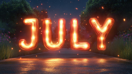 July in Blazing Lights A Retro Neon Sign for Summer Festivities, Celebrations, Events.