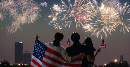 Family holding american flag with fireworks at twilight background design for USA 4th july independence day or other celebration