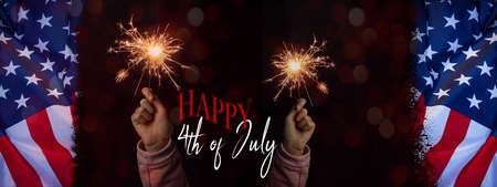 Happy 4th of July - Independence Day Party festive celebration USA background banner panorama template greeting card - Blue white red firework and girl with sparkling sparklers in her hands
