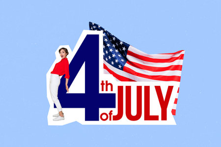 Creative abstract template collage of funny female lean on date celebrating 4th july usa independence day bizarre unusual fantasy billboard