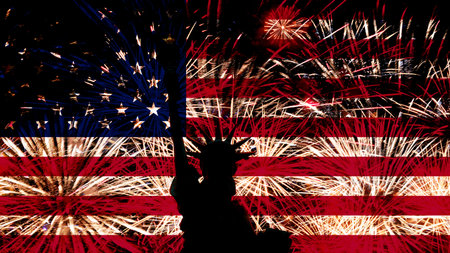 Patriotic background, Statue of Liberty on the background of fireworks, independence day.
