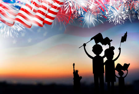 Patriotic holiday. Silhouettes of people holding the Flag of USA. America celebrate 4th of July.