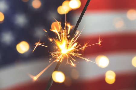 A close-up shot of a lit sparkler in front of a blurred American flag, creating a vibrant and festive backdrop for a celebration.