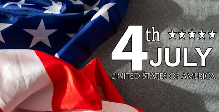 4th of July text and United States of America flag folded on red background. USA Happy Independence Day concept.