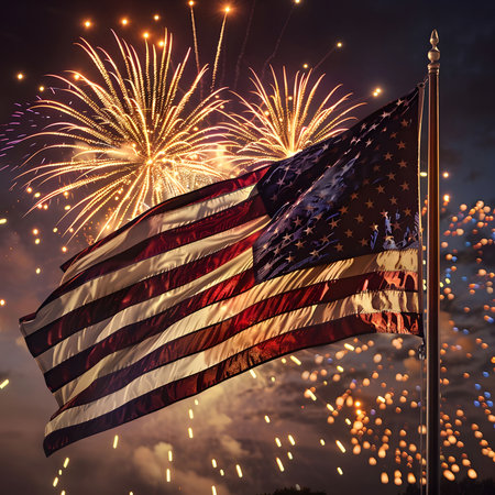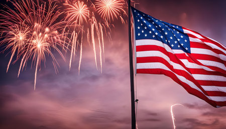 A close-up shot of the American flag with fireworks exploding in the background. The red, white, and blue colors are vibrant, and the stars and stripes are clearly visible. The fireworks add a sense of celebration and joy to the image.