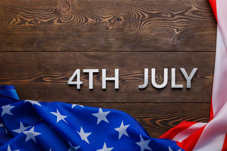 the words 4th july and crumpled usa flag on flat textured wooden surface background