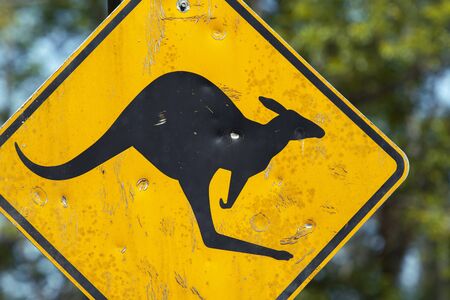 Damaged yellow kangaroo warning sign closeup