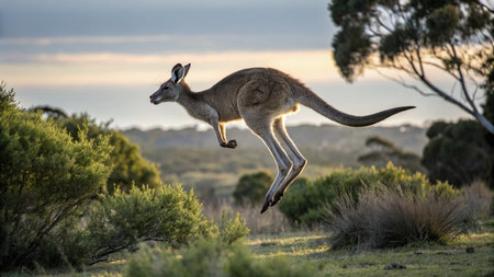 Kangaroo (Macropus giganteus) jumping at sunset