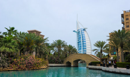 DUBAI, UAE - MARCH 15,2021: Burj al Arab seen from Madinat Jumeirah, Dubai