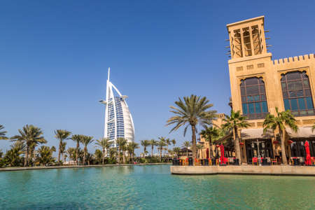 DUBAI, UAE - FEBRUARY, 2018: View on Burj Al Arab, the world only seven stars hotel seen from Madinat Jumeirah, a luxury resort which include hotels and souk spreding across over 40 hectars.