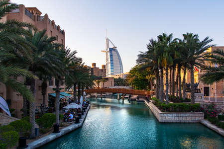 Dubai, United Arab Emirates - April 20, 2018: Burj al Arab and Madinat Jumeirah resort and restaurants in Dubai at sunset