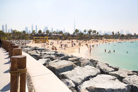 Dubai, United Arab Emirates January 16, 2020: People on the beautiful public beach with turquoise water in Persian Gulf shoreline, Dubai.