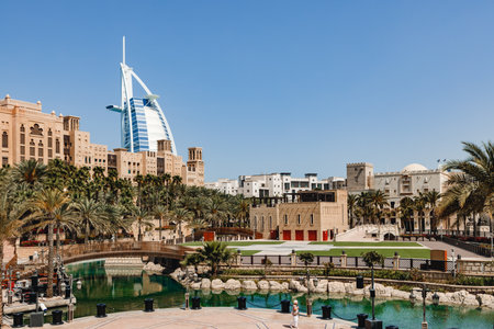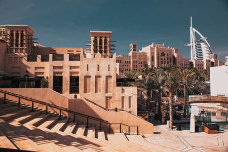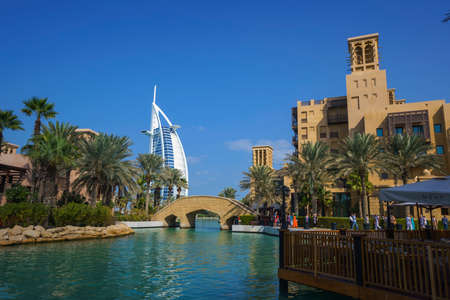 DUBAI, UNITED ARAB EMIRATES - JANUARY 31, 2020: Madinat Jumeirah luxury hotel in a summer day in Dubai in a sunny day , United Arab Emirates