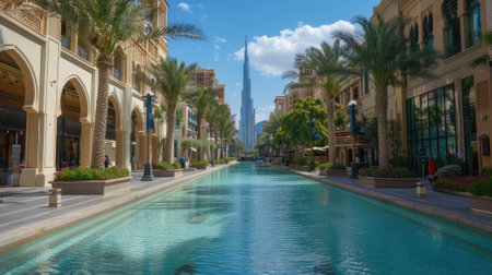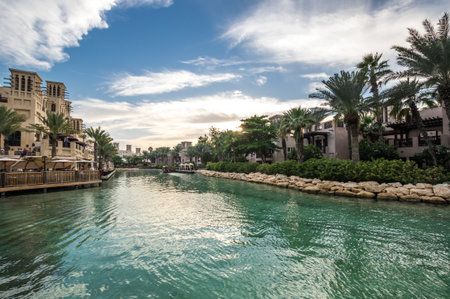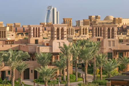 DUBAI,UAE - jANUARY 05,2018: Panoramic view of the Madinat Jumeirah in Dubai with palms tree.Madinat Jumeirah houses three iconic hotels in Dubai, also including Mina Salam and Burj al Arab