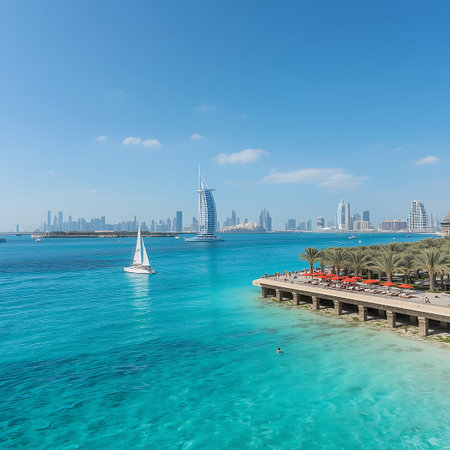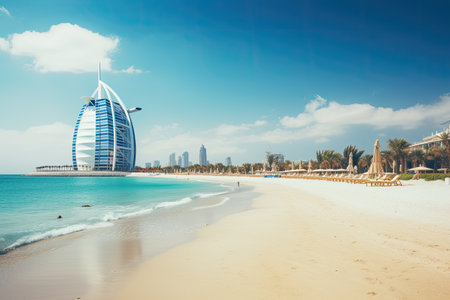 Burj Al Arab hotel in Dubai, United Arab Emirates. Burj Al Arab is one of the most expensive hotels in the world, View of the luxury beach of Dubai and Burj al arab, AI Generated