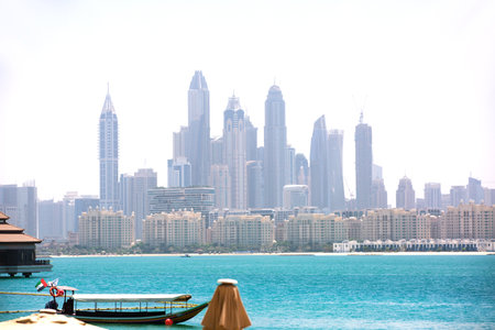 DUBAI, UAE - MAY 5,2017: Beautiful panoramic view of Dubai Marina beach with skyscrapers in the background in Dubai, UAE