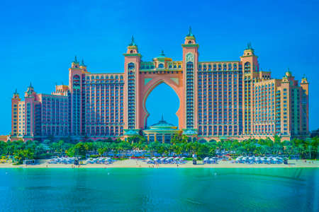 DUBAi, UAE - DECEMBER 30 2017: view from the top of Atlantis the Palm beach in Dubai with the city cityscape in the background