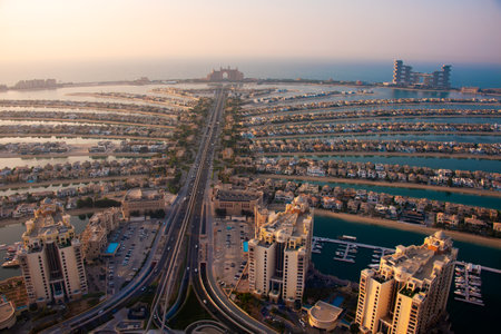 Palm Jumeirah island in Dubai on sunset, modern architecture, beaches and villas