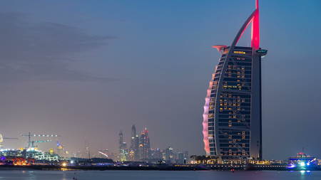 DUBAI, UAE - 03 JAN 2016: Dubai skyline with Burj Al Arab hotel during sunset day to night transition timelapse. View from palm jumeirah. Burj Al Arab is a luxury 5 stars hotel built on an artificial island in front of Jumeirah beach.