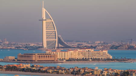 Dubai skyline with villas nad Burj Al Arab during sunset timelapse. Top view from atlantis on palm jumeirah.