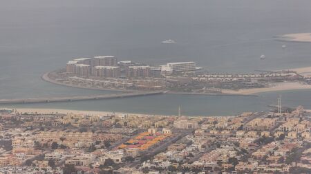 Palm Jumeirah aerial timelapse during sunset. View from Internet city with construction site and villas. Dubai, United Arab Emirates