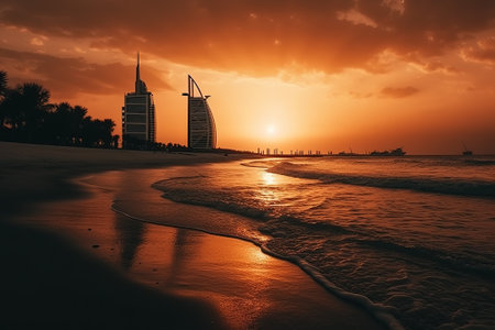 Dubai Downtown skyline with waves on sea beach, United Arab Emirates or UAE. Financial district in travel vacation concept. Urban city. Skyscrapers buildings with sunset sky.