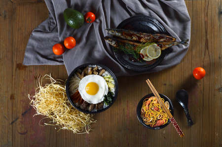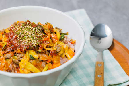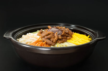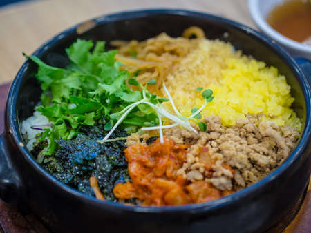Korean food Bibimbap, Rice topped with sautéed beef and a variety of colorful vegetables that is mixed at the table with spicy gochujang. A hint of sesame oil helps bring out the flavor.