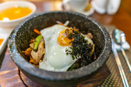 Bowl of hot Bibimbap. Mixed rice with meat, fried egg and assorted vegetables. Bibimbap is a popular Korean dish.