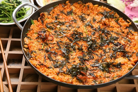 Stir-fried rice made from leftover broth from spicy stir-fried small octopus, in black pot