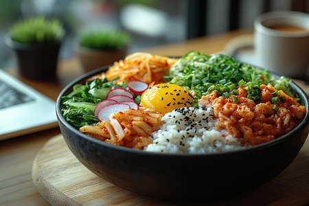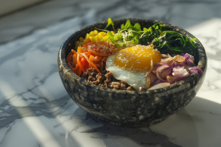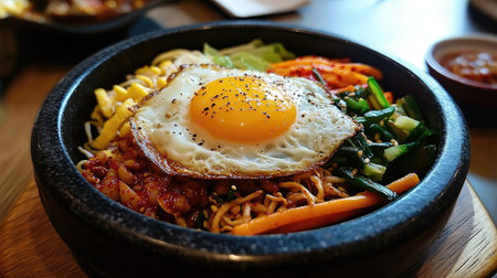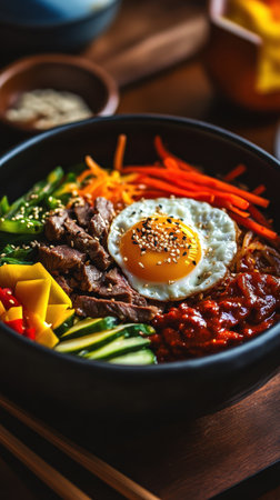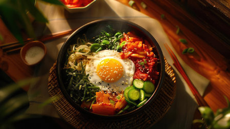 A colorful bowl of bibimbap with a perfectly fried egg on top, surrounded by an array of fresh vegetables and spicy gochujang, embodying the balance and harmony in Korean flavors.