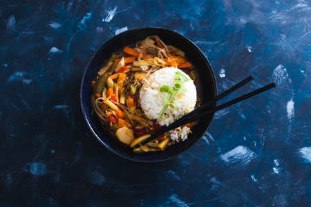 Traditional asian dish with rise and wok roasted meat, vegetables and mushrooms. Top view with space for text